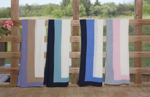 The Blues Collection features tailored, sophisticated simplicity. With clean lines and borders, they offer crisp elegance for the curated home. Made from 100% sustainably sourced Mongolian Cashmere.