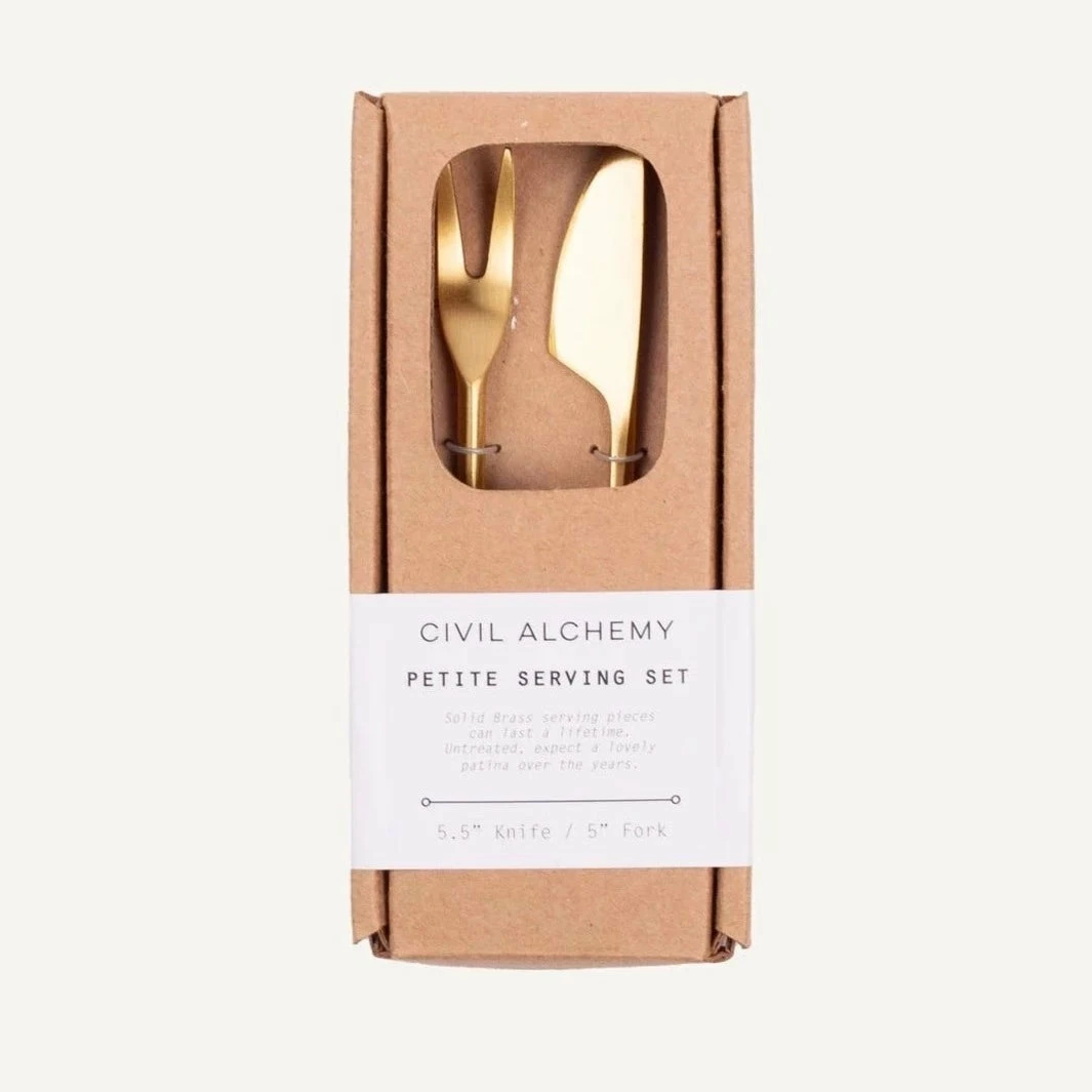 Solid brass serving pieces can last a lifetime. Untreated-expect a lovely patina over the years. Civil Alchemy’s serve ware collection is cast in India, and is durable and functional. Great for gifts and special occasions.