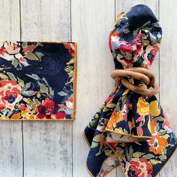 These floral napkins are so striking! With a navy blue background, the colors in the flowers really pop. Easy to care for.