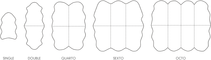 Sizes: Single (~2×3), Double (~2×6), Quarto (~4×6), Sexto (~5×6), Octo (~6×7), Decto (~6×8.5) (see size chart for visual)
